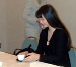 受賞作家:川上弘美さん受賞者控え室で。 これから受賞作品にサイン。 |