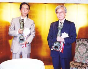 正賞のブロンズ像を持って日野啓三氏・川村二郎氏
